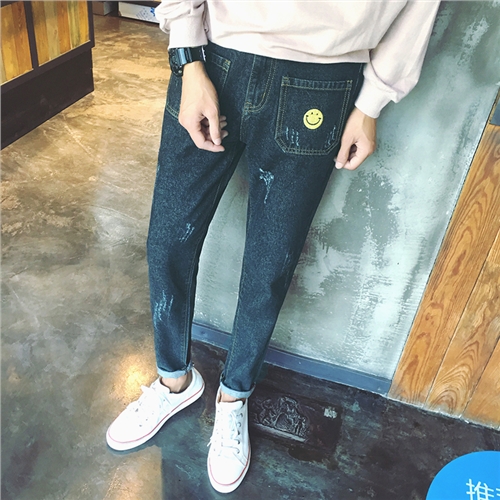 秋冬新款雙口袋設計笑臉韓版修身小腳男士牛仔褲