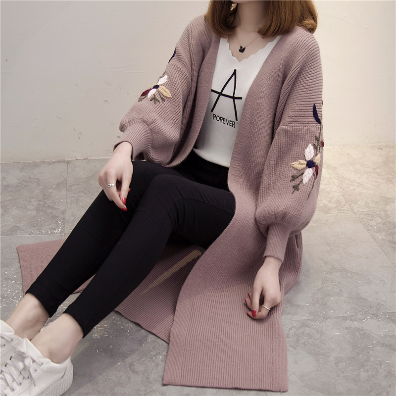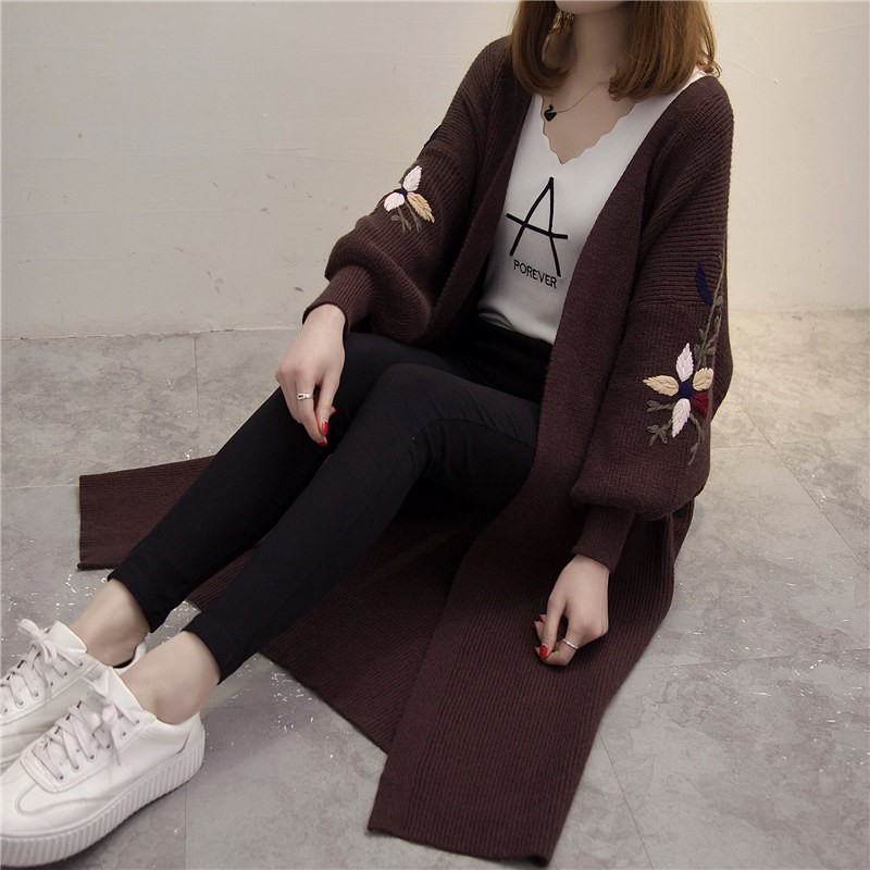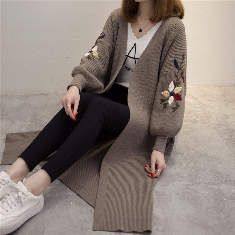 / 春裝新款個性刺繡寬松大碼毛衣女中長款長袖針織衫開衫外套潮