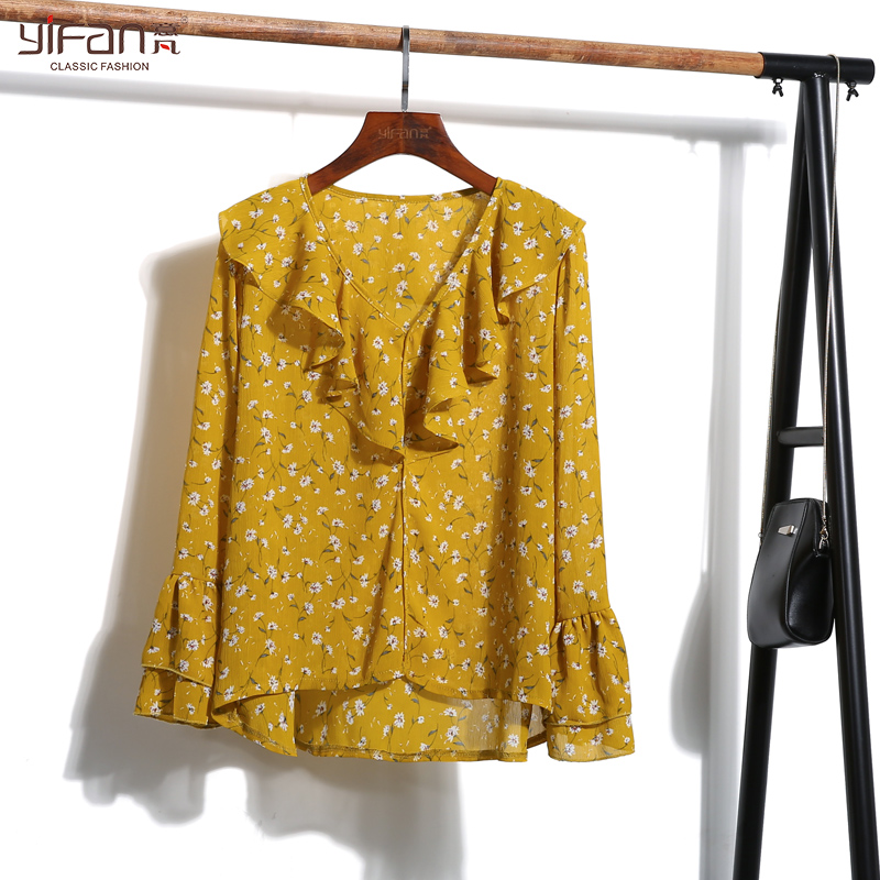 / 韓版夏新款荷葉邊喇叭袖氣質小清新雪紡衫女碎花長袖寬松V領襯衫