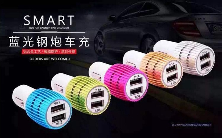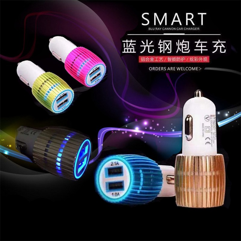 / 高品質智能車載充電器 手機通用藍光小鋼炮2A雙usb金屬圈車充批發