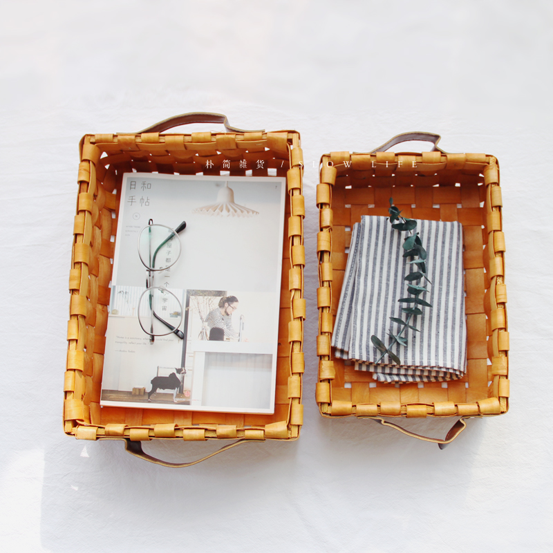 樸簡 日式田園風原木木片收納籃 手提面包籃 餐具桌面水果收納籃