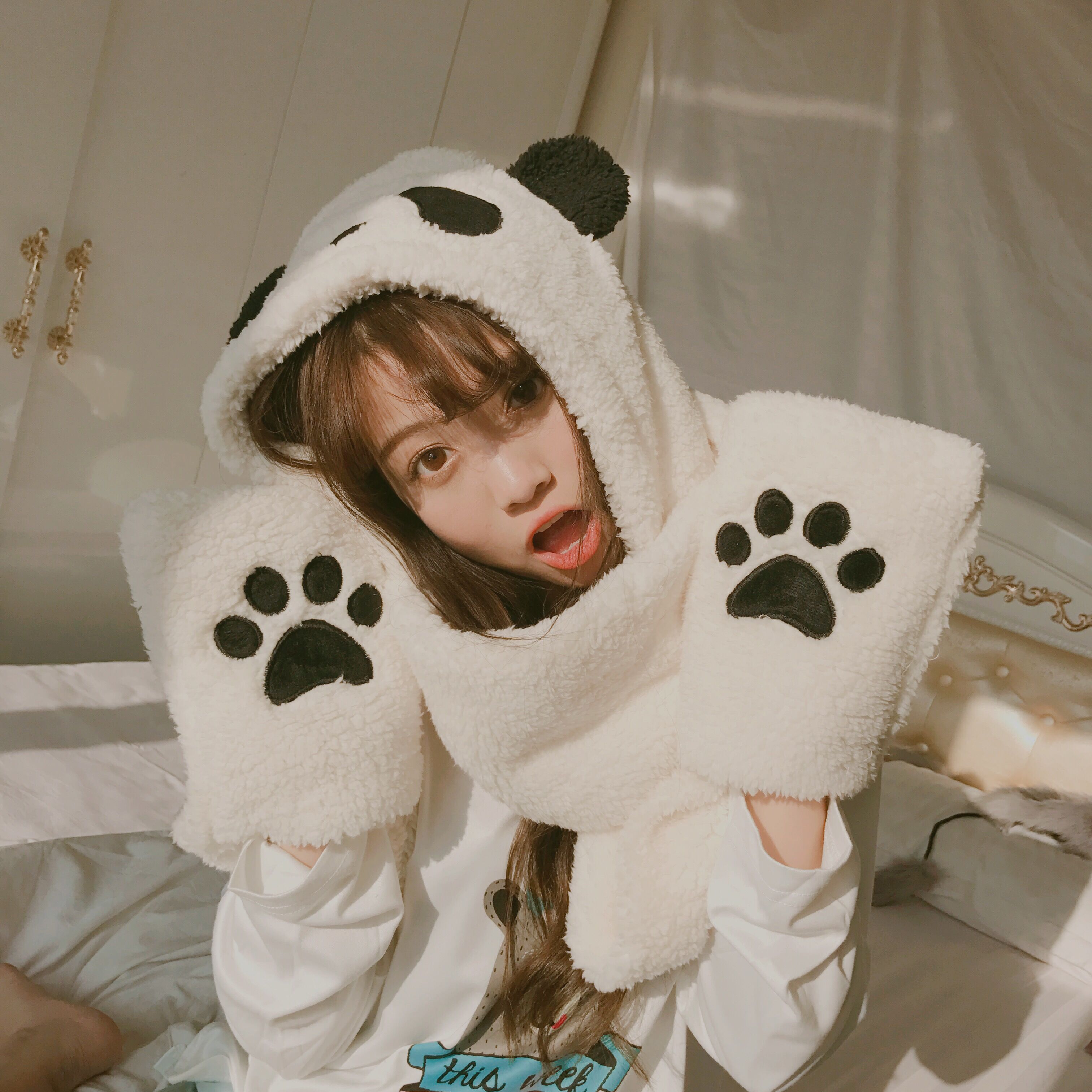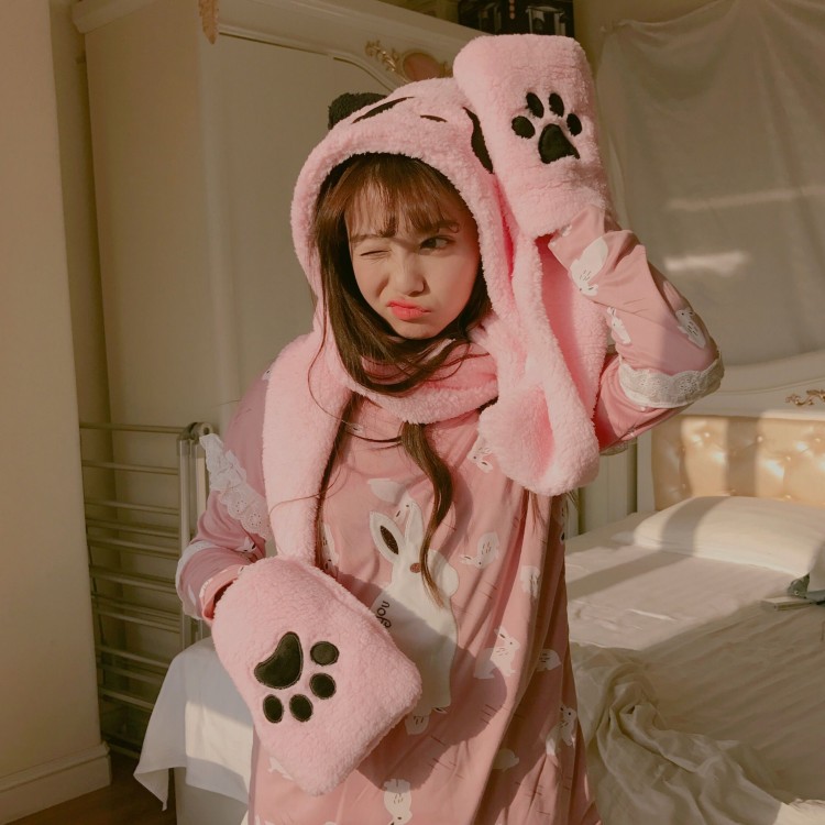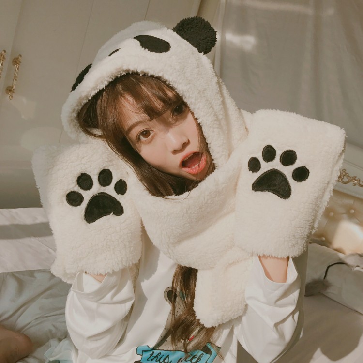 冬款日系軟妹可愛熊貓加厚圍脖帽子手套三件一體保暖護耳帽女