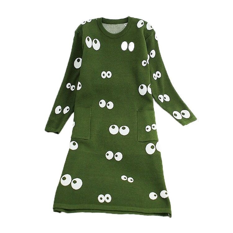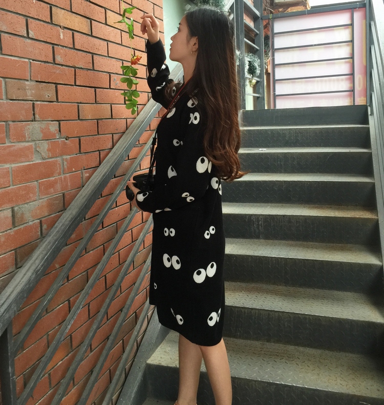 / 韓國秋冬款圓領長袖眼睛圖案學生針織連衣裙女中長款打底裙