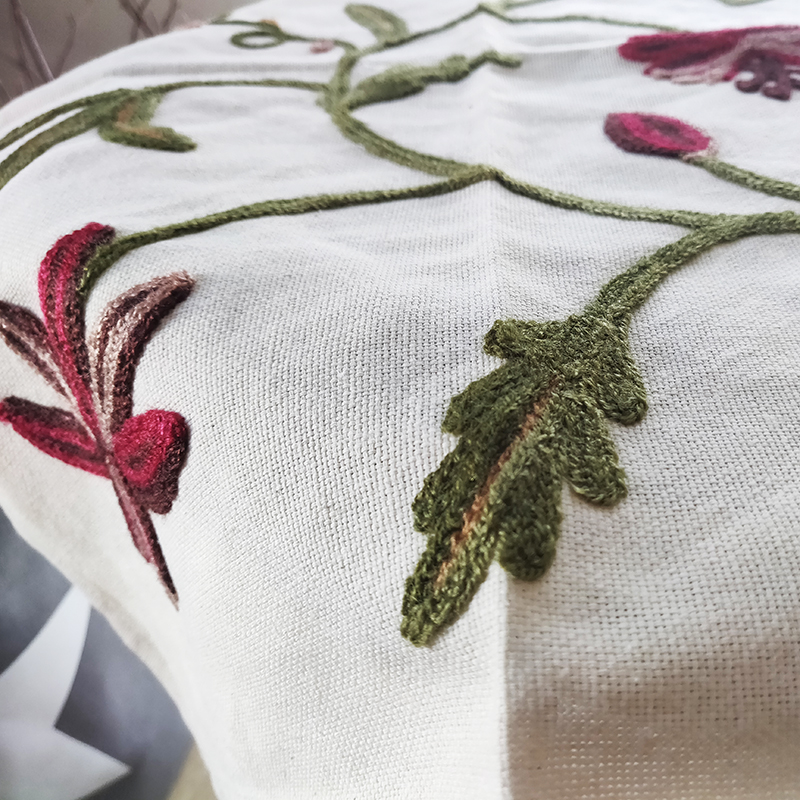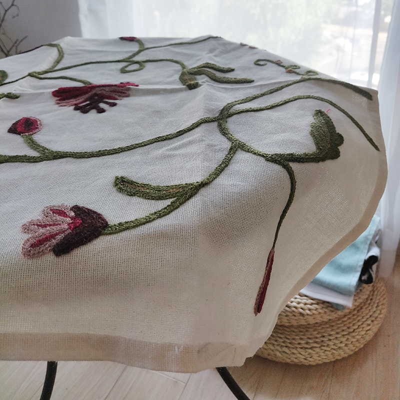 關于她:帆布質地綴以細密針腳的絨線繡花,柔曼的枝條呵護著靜美的花朵,似為點綴的飾品,更像在訴說生活的主調……另有同花色桌旗搭配等。