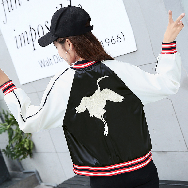 棒球服女2017新款秋緞面韓版學生寬松bf刺繡仙鶴情侶夾克短款外套