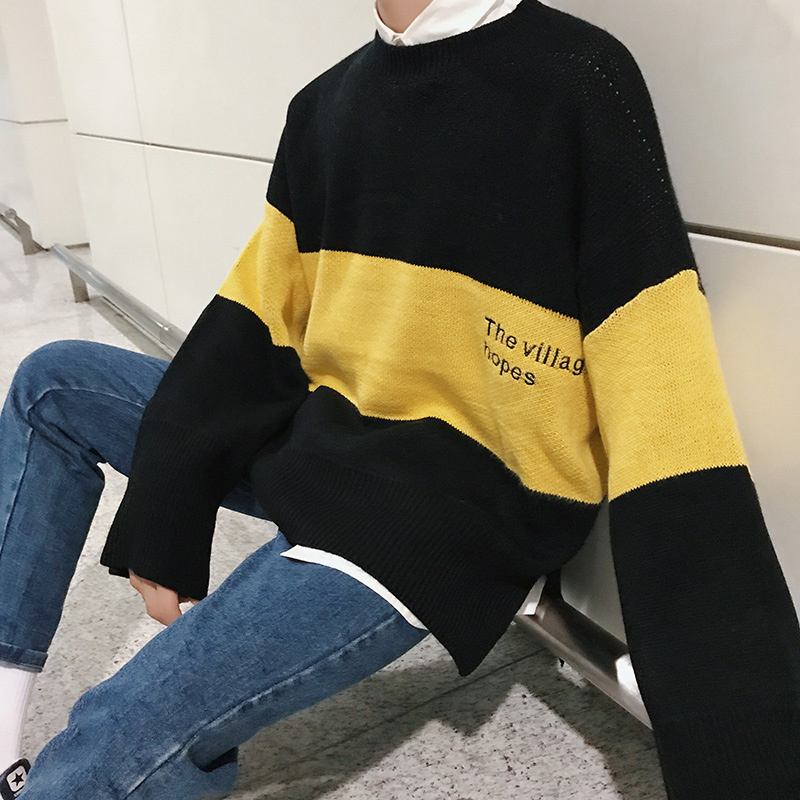 文藝男女店寬松套頭男士毛衣冬季潮流拼色針織衫秋季韓版帥氣外套