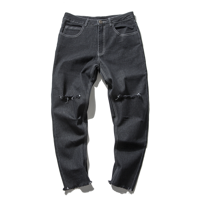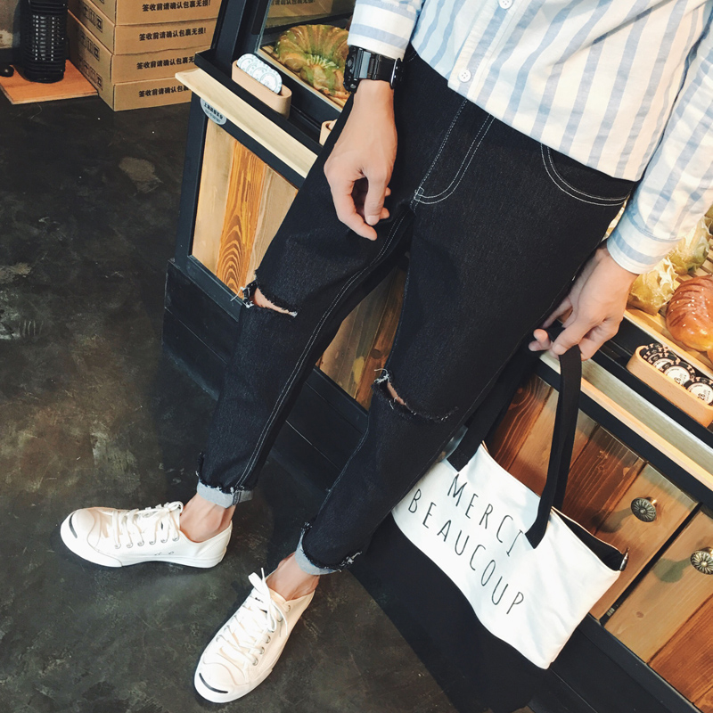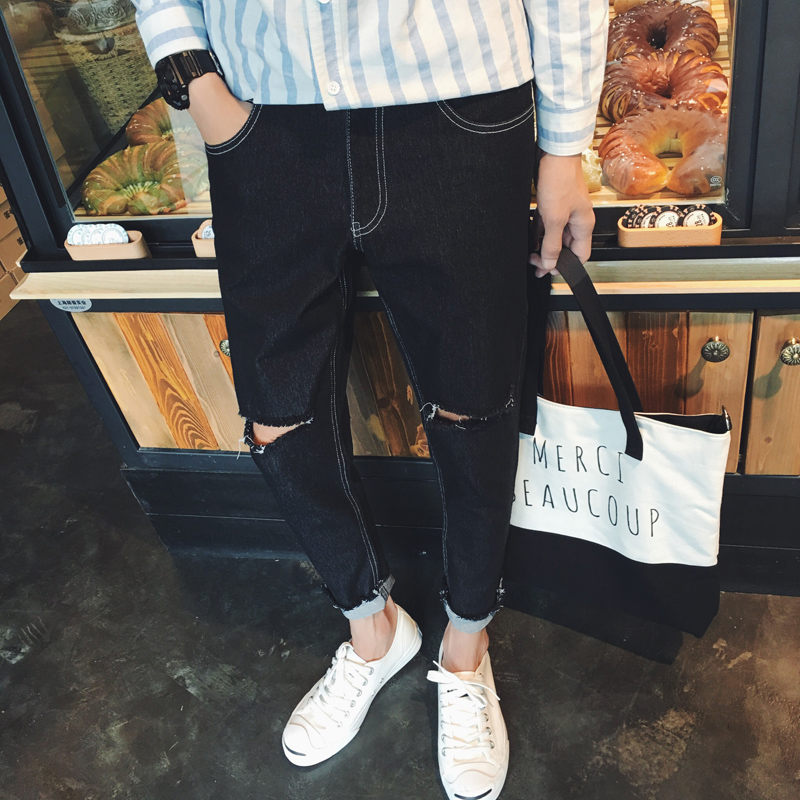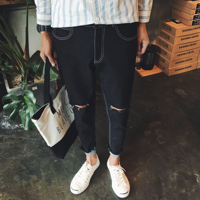 / 新品韓版毛邊膝蓋破洞修身牛仔褲錐形休閑褲男