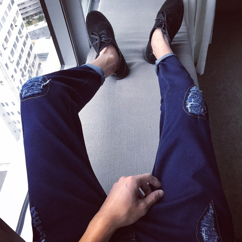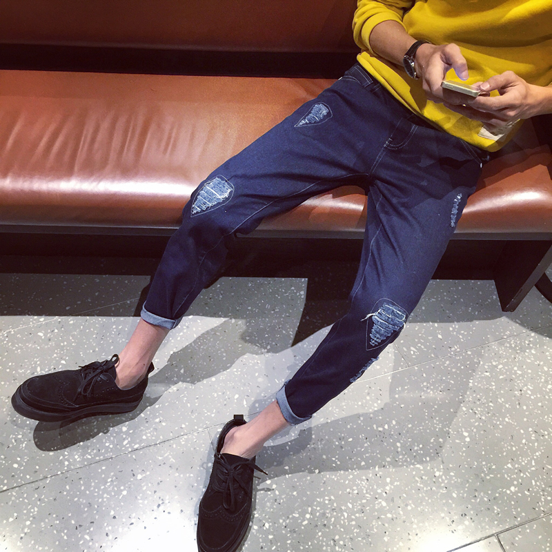 / 秋季新款韓版膝蓋補丁小腳錐形修身牛仔褲哈倫褲男