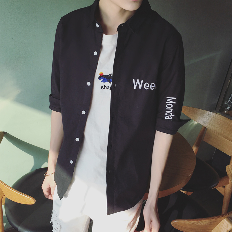/ 原創日韓字母繡花小清新男士修身七分袖襯衫
