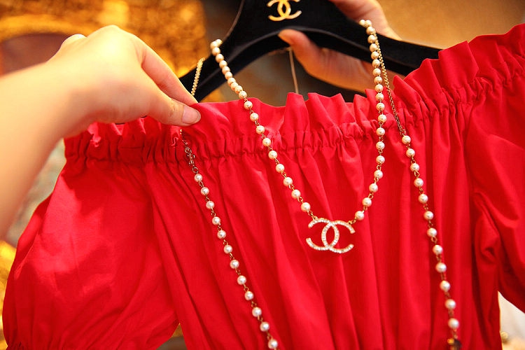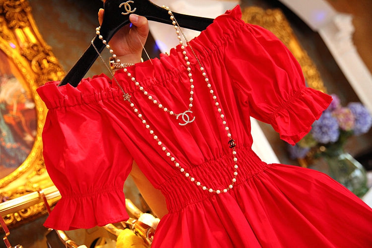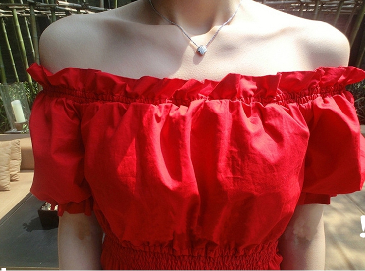 夏裝歐美大碼女裝性感顯瘦一字領露肩泡泡短袖紅色蓬蓬連衣裙