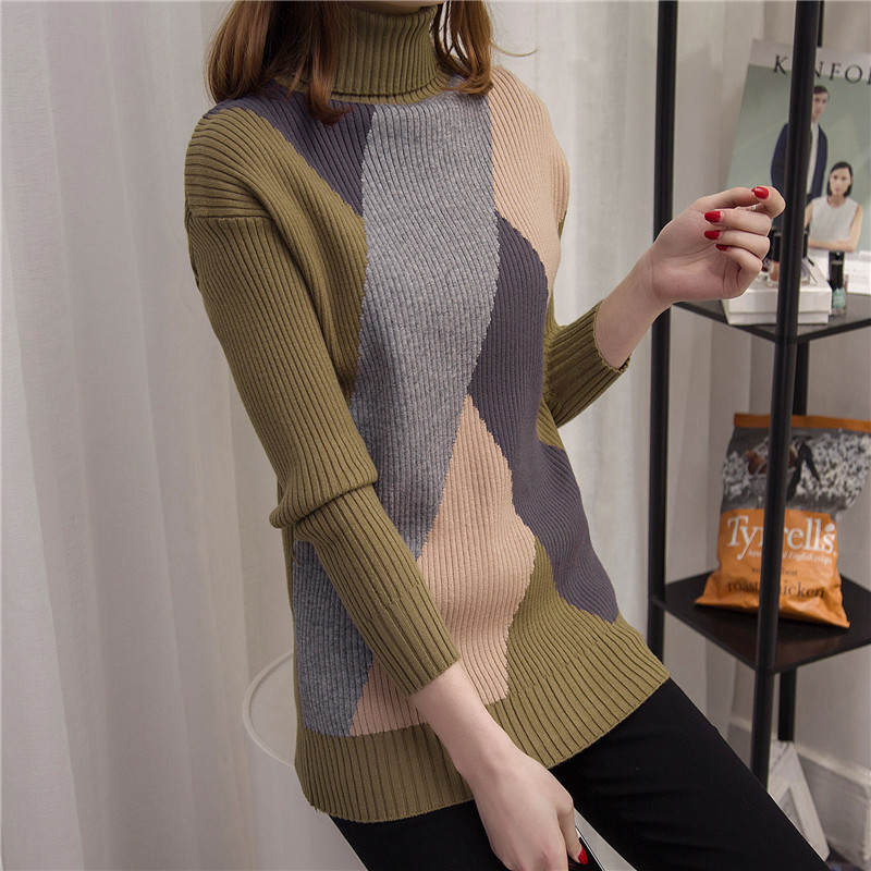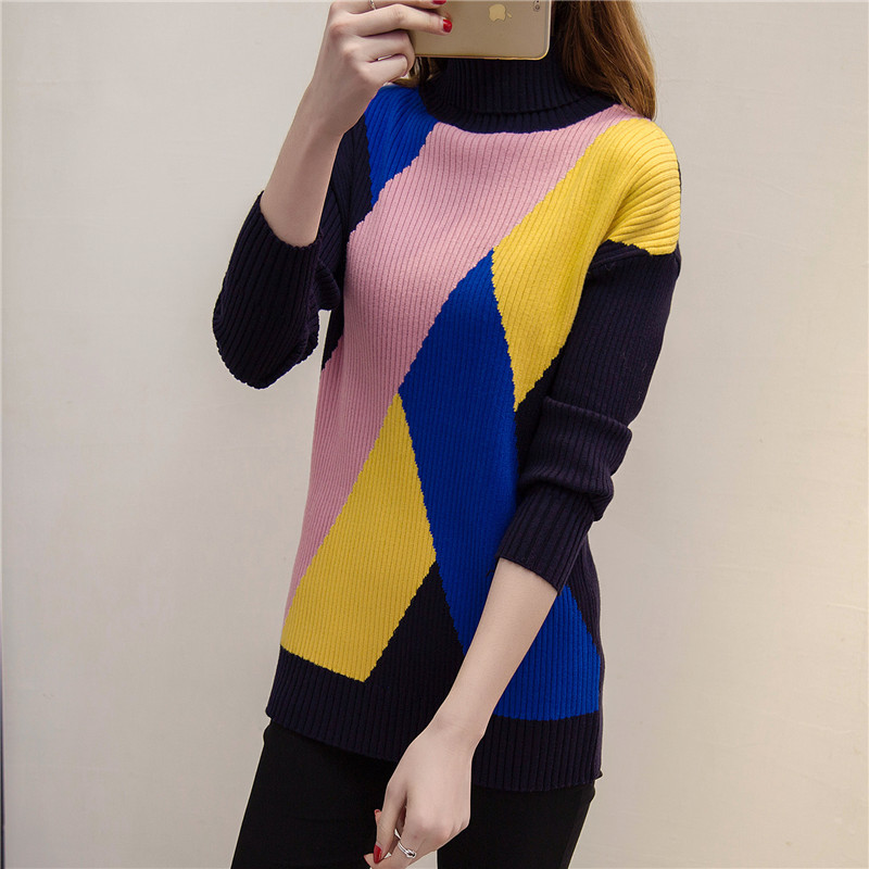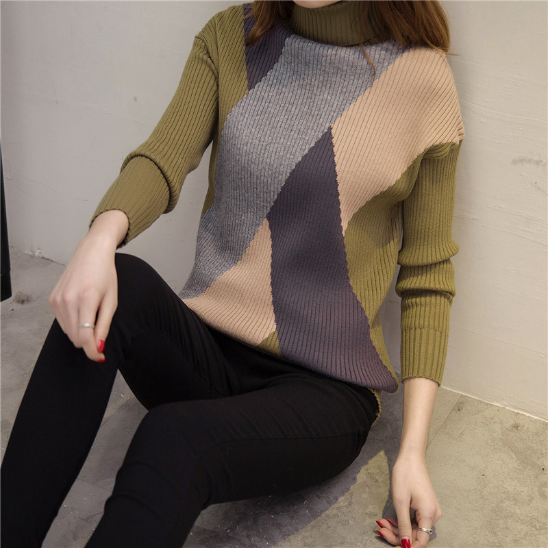 高領毛衣女針織衫套頭拼色長袖打底衫外套女裝冬裝新款韓版潮
