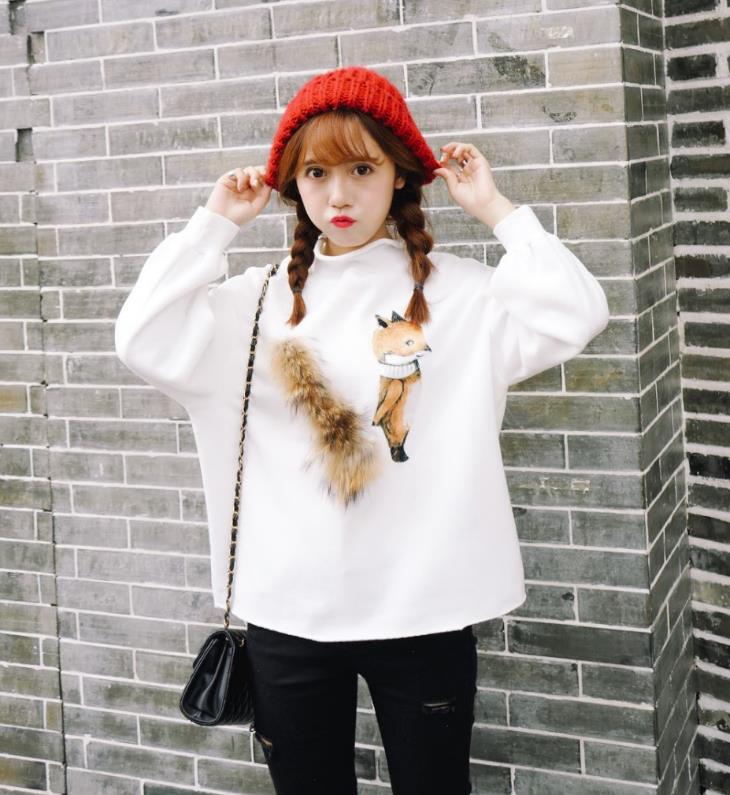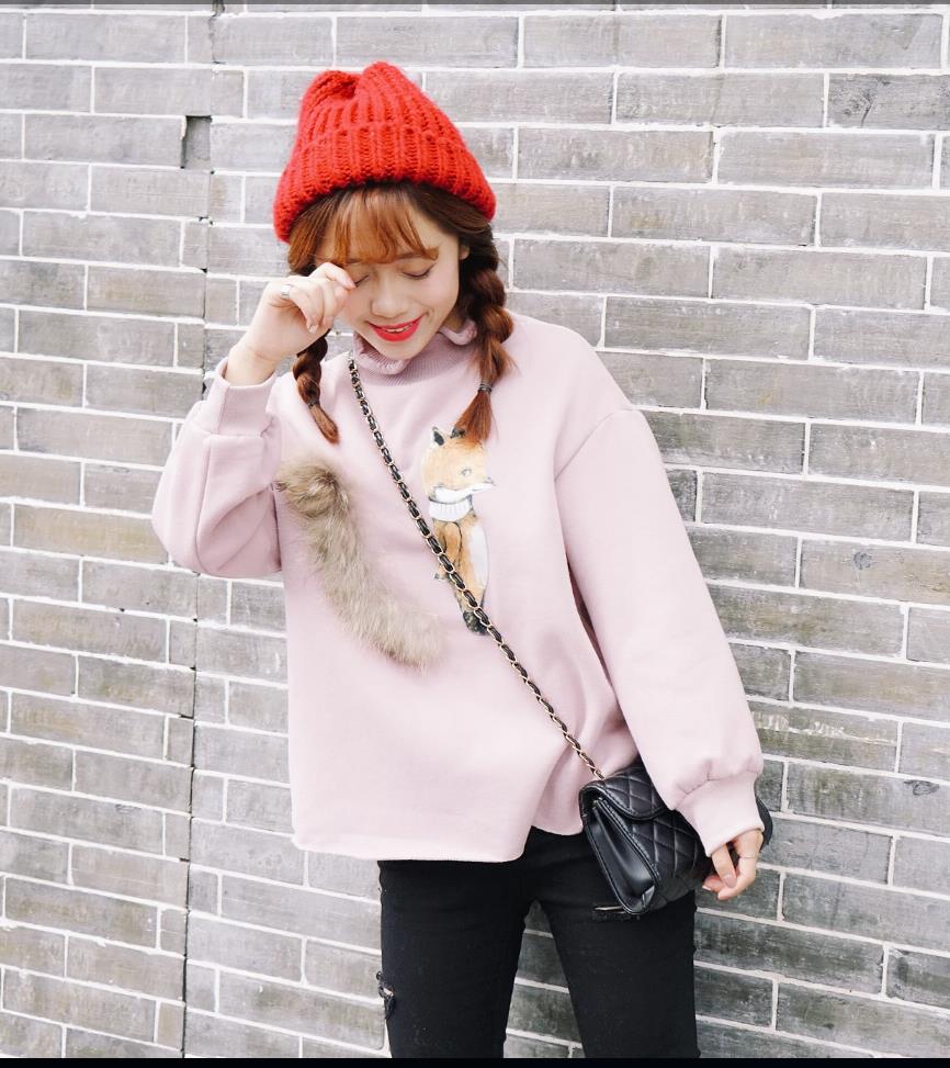 韓國甜美學院風冬款超萌卡通狐貍花邊領抓絨加厚套頭衛衣女