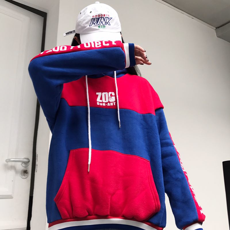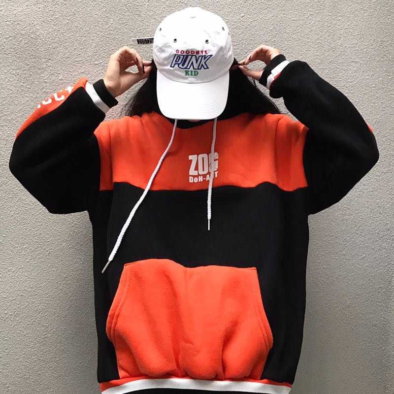 韓國學院風冬款撞色拼接連帽抽繩字母印花套頭抓絨加厚衛衣女