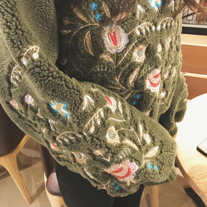 / 冬款韓國復古chic重工復古花朵刺繡保暖羊羔毛長袖套頭衛衣女