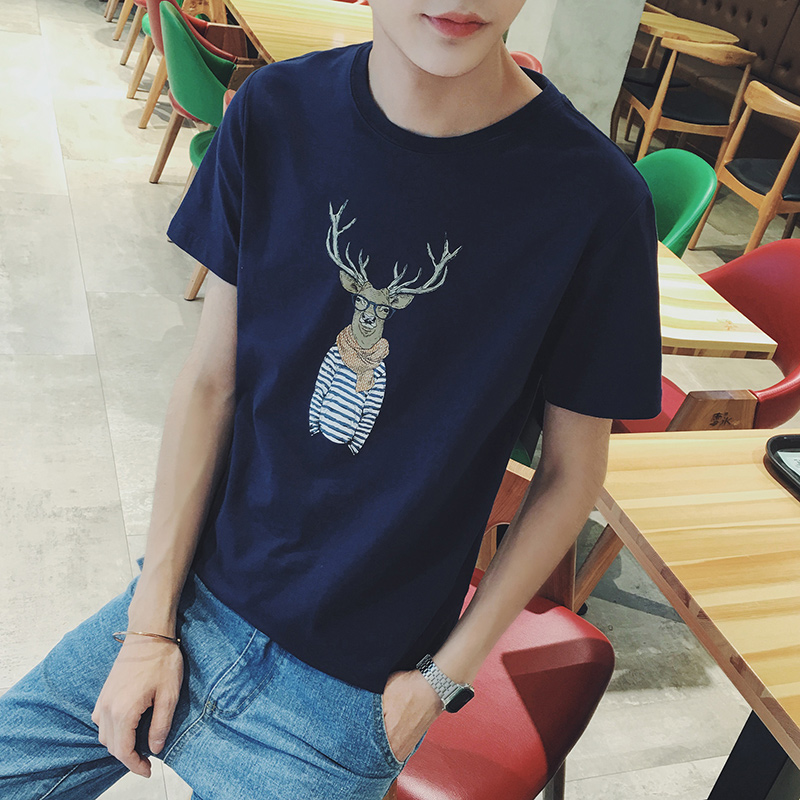 / 夏裝卡通小鹿動物印花短袖韓版修身男士T恤潮