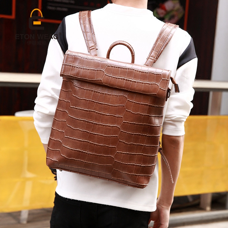 / 韓版新款男士背包潮流鱷魚紋PU皮復古學生書包電腦包旅行雙肩包