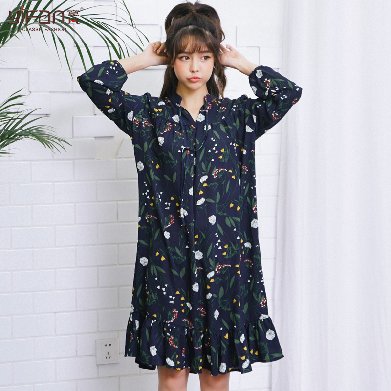/ 夏季寬松雪紡印花泡泡袖百褶連衣裙女裝韓版蝴蝶結中長碎花裙
