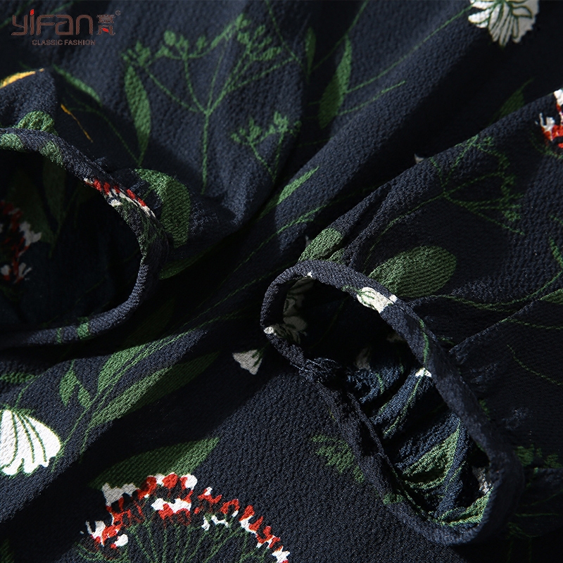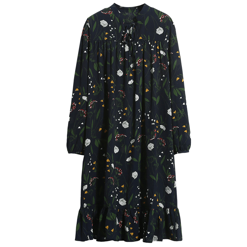 夏季寬松雪紡印花泡泡袖百褶連衣裙女裝韓版蝴蝶結中長碎花裙