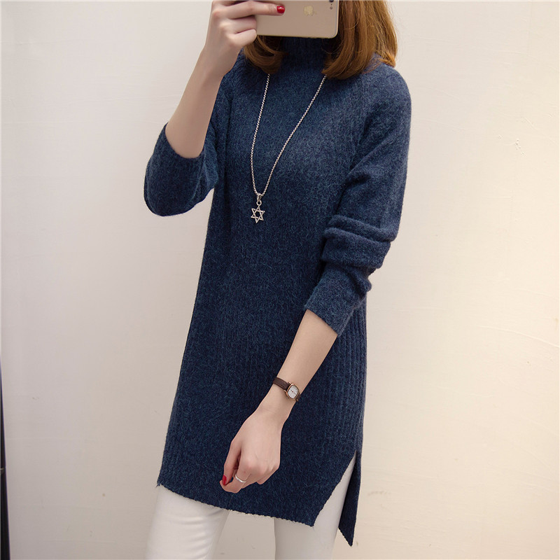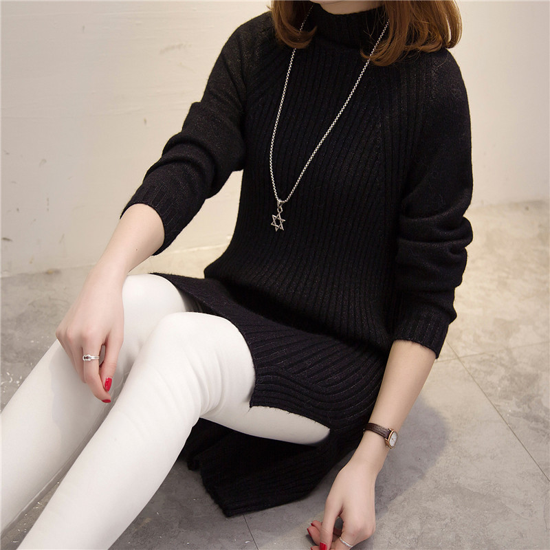 / 半高領冬季女裝中長款開叉韓版長袖毛衣女套頭純色加厚針織新款潮