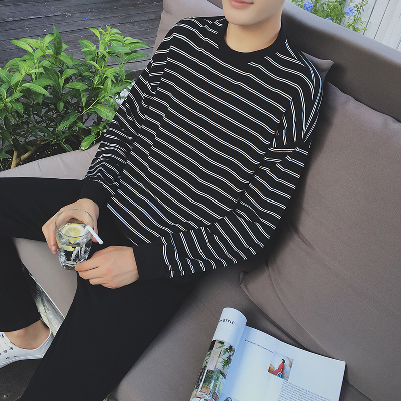 / 新款男裝港風加厚加絨圓領男士條紋寬松衛衣打底衫
