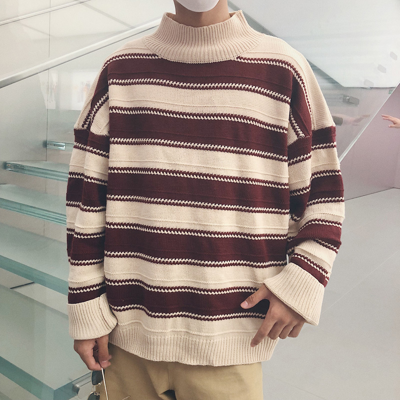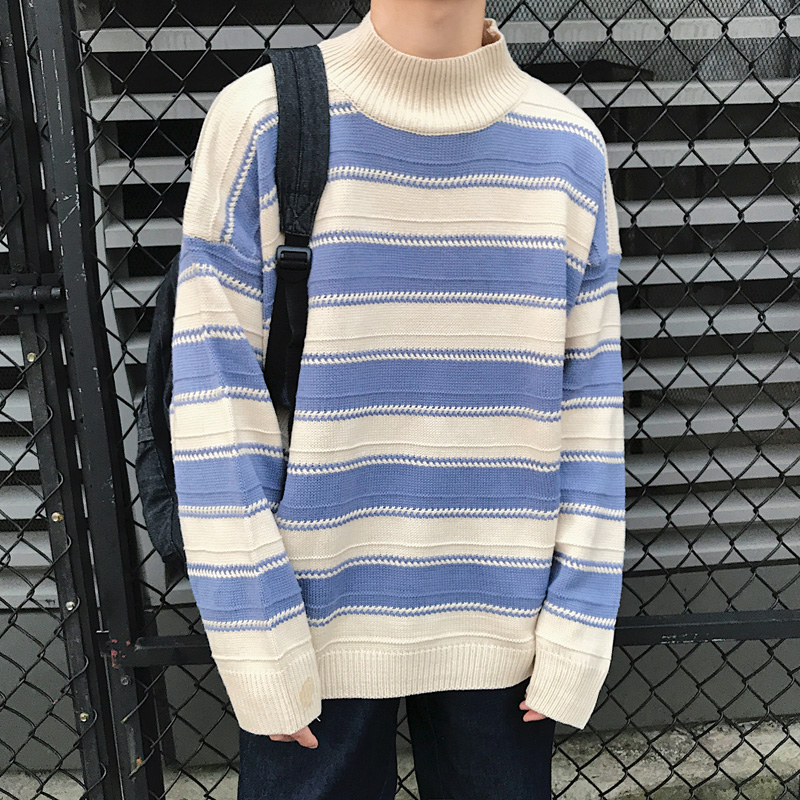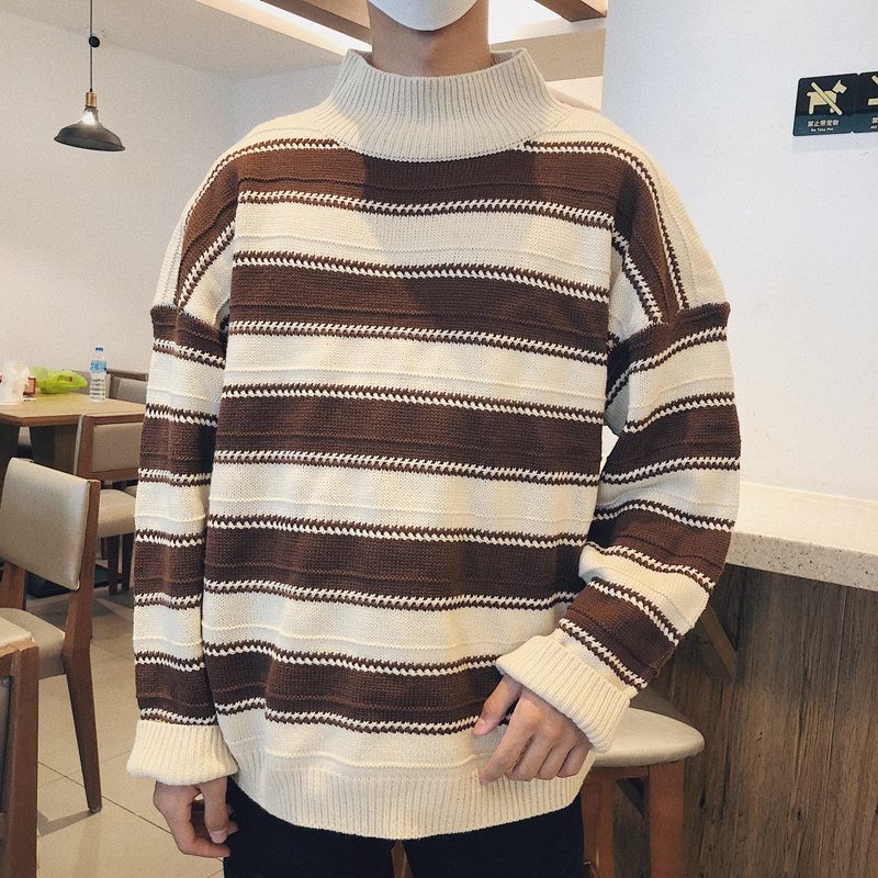 / 文藝男女店加厚學生毛衣冬季潮流半高領針織衫男士韓版條紋外套男