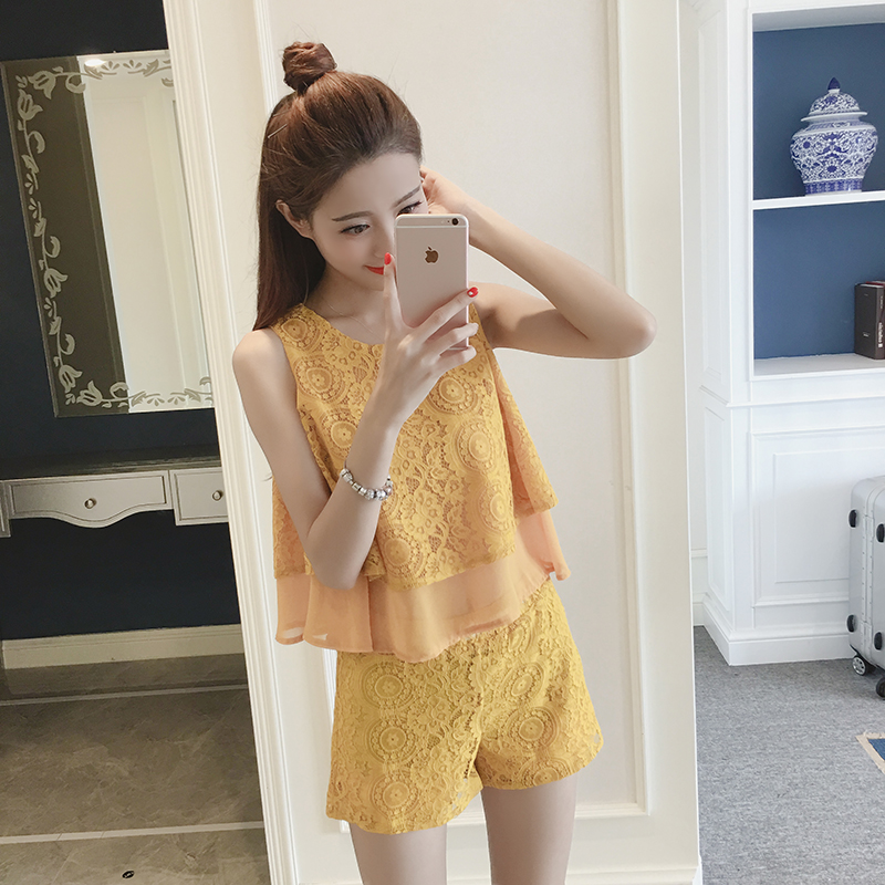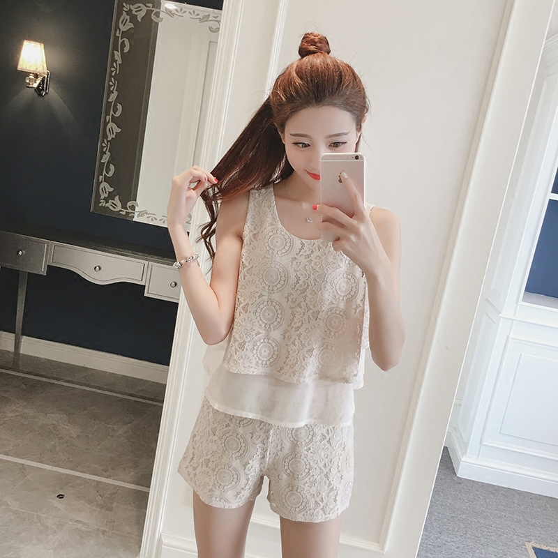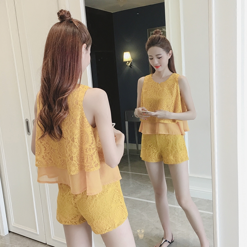 / 夏季新款韓版名媛氣質拼接無袖上衣兩件套女休閑短褲蕾絲套裝