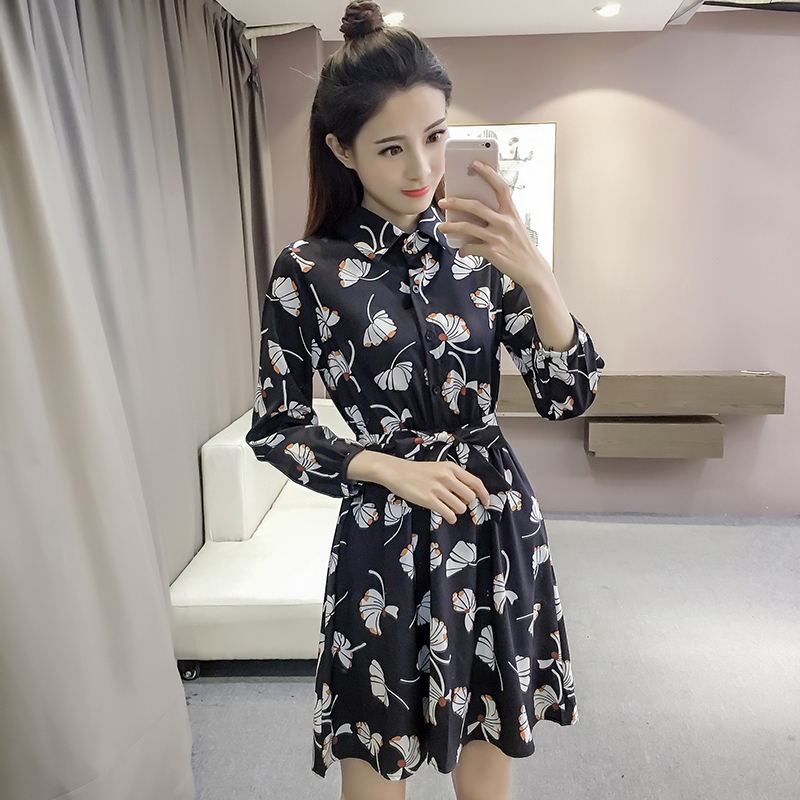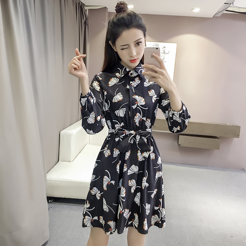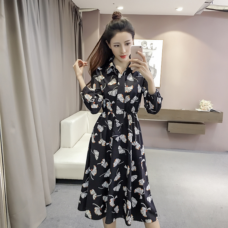 新款女裝復古印花中長款收腰修身氣質碎花雪紡襯衫連衣裙春秋
