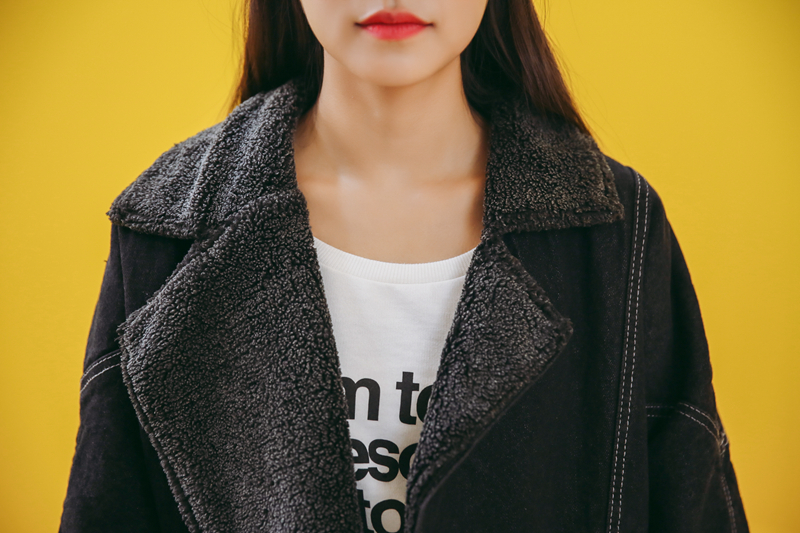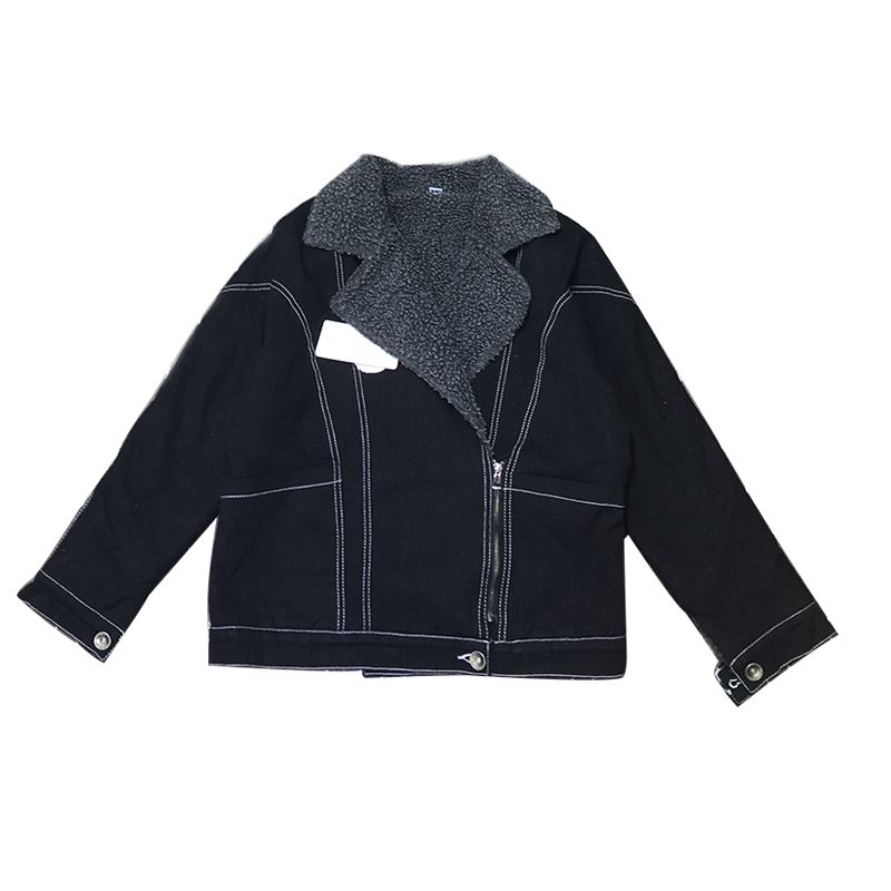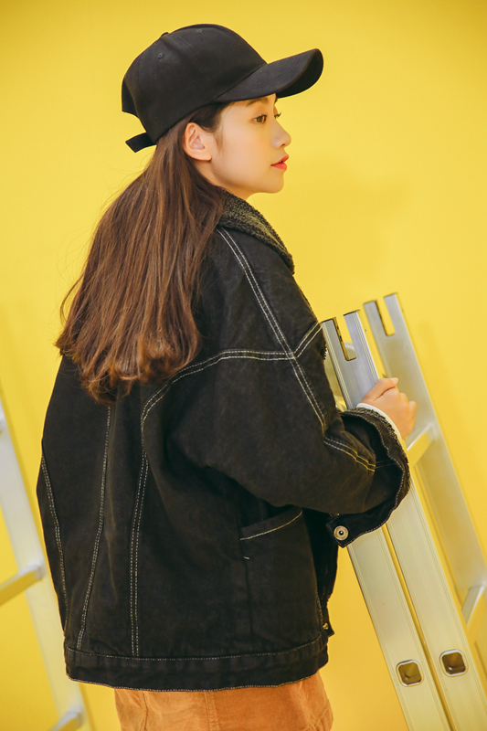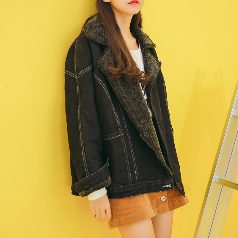 / 冬款韓國加厚保暖羊羔毛翻領拉鏈百搭黑色牛仔外套棉衣棉服女