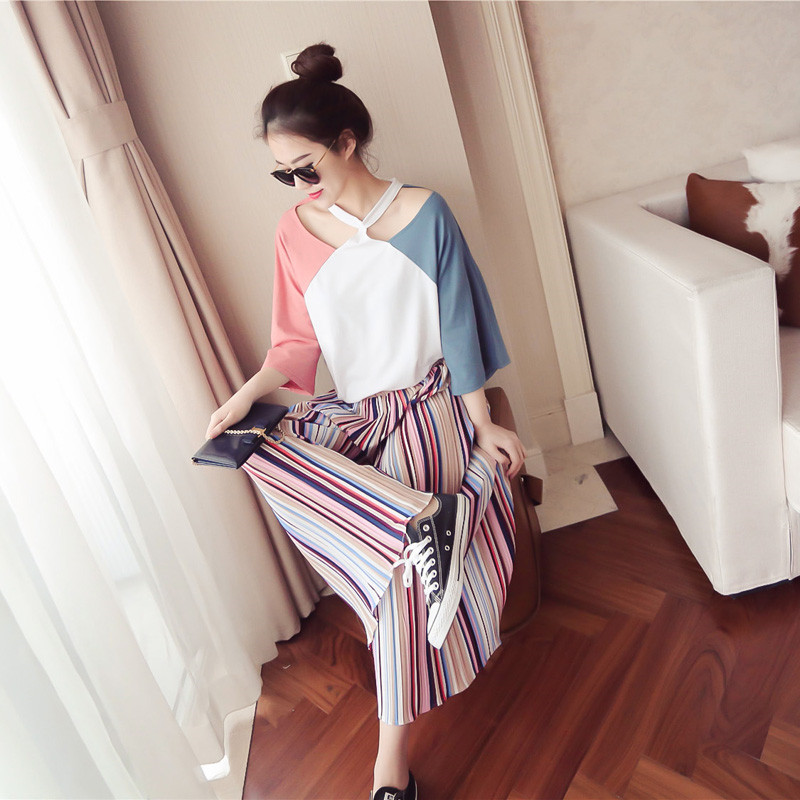 / 2017韓版夏季新款掛脖T恤七分袖女寬松露肩拼色打底衫撞色上衣潮