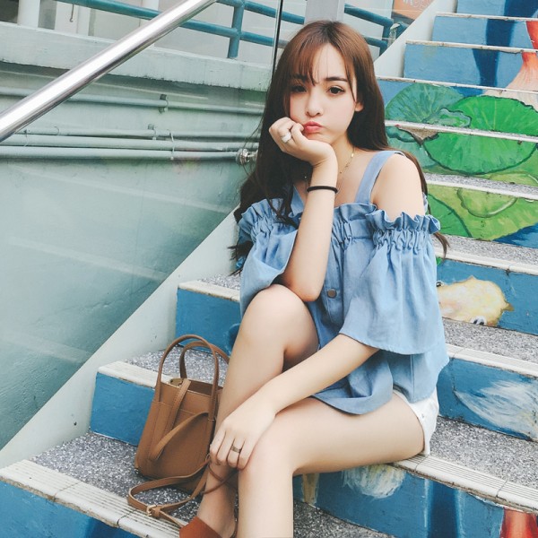 / 女款上衣春季2017新款漏肩襯衫漏肩一直領露肩韓版一字肩百搭個性