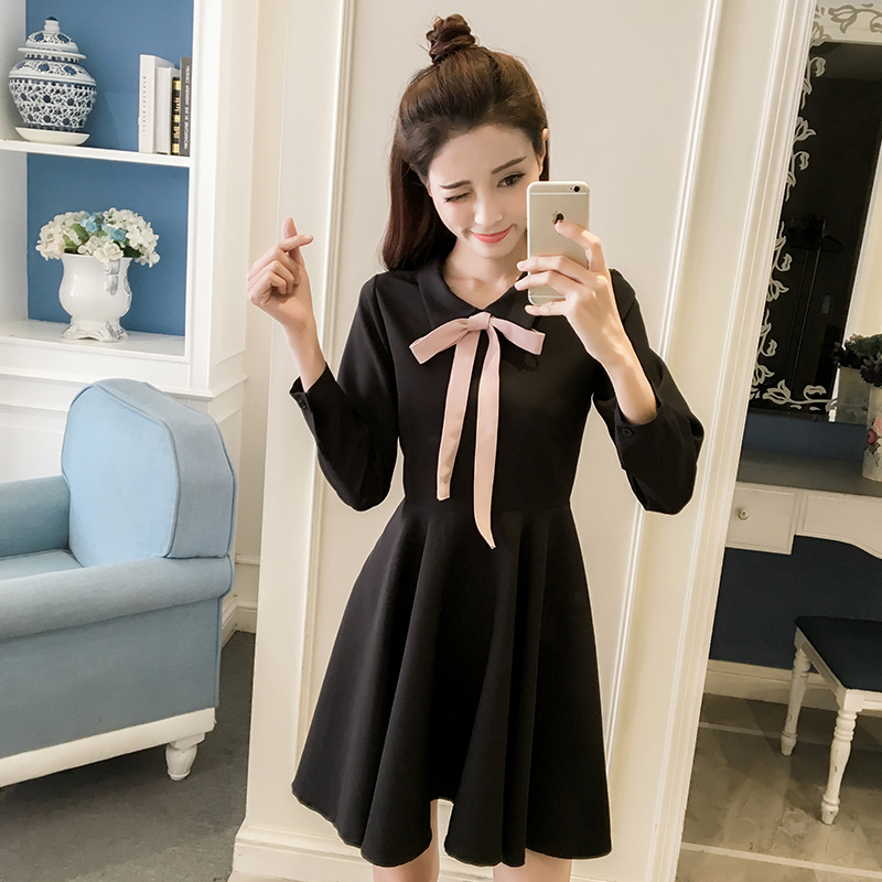 / 早春新款復古赫本小黑裙顯瘦高腰長袖連衣裙秋冬女蓬蓬打底裙