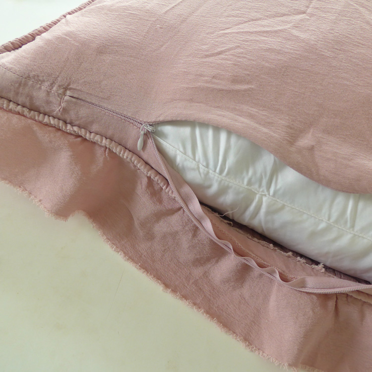 正面是絎縫手感好,背面沒有絎縫,背面隱形拉鏈,靠墊芯是填充羽毛,無味,符合外商要求;