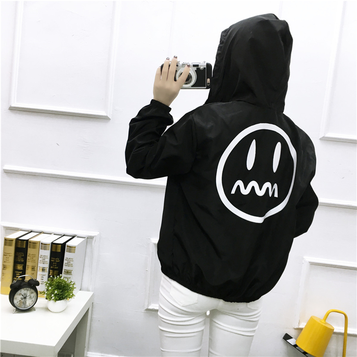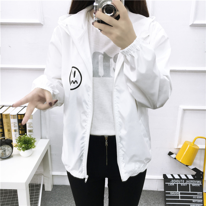 / 字母印花連帽系帶短款風衣女防曬衣短外套女春秋韓版學生百搭上衣