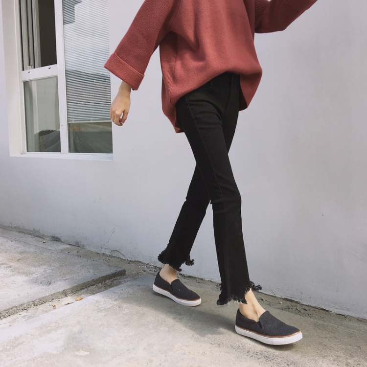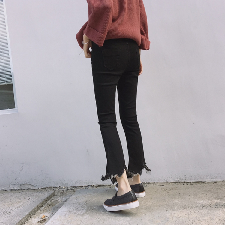 今年流行的喇叭褲型 褲腳做了毛邊須須 走動起來很好看~ 微喇的牛仔褲一直都是修飾腿型的好幫手 不用怕小腿粗 九分的長度剛好顯腿細 面料是用的有彈力的牛仔布面 穿起來很舒服 這樣的褲子可以小女人的穿法 也可以休閑的穿著