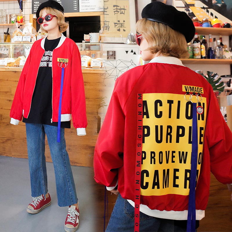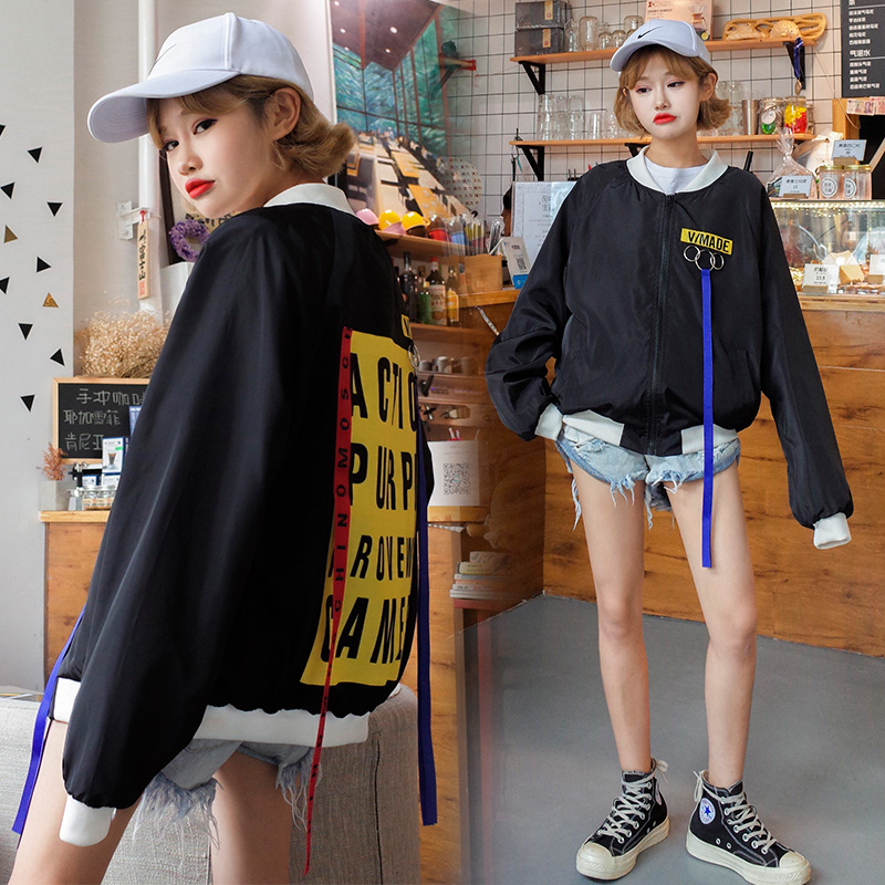 2017秋季新款韓版寬松后背字母貼布飄帶棒球服學生原宿風外套女潮