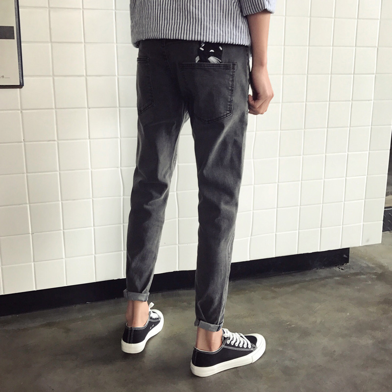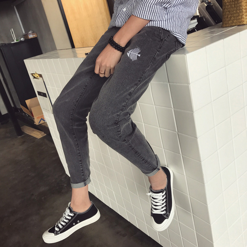 / 男裝刺繡圖案韓版新款修身小腳牛仔褲錐形哈倫褲男