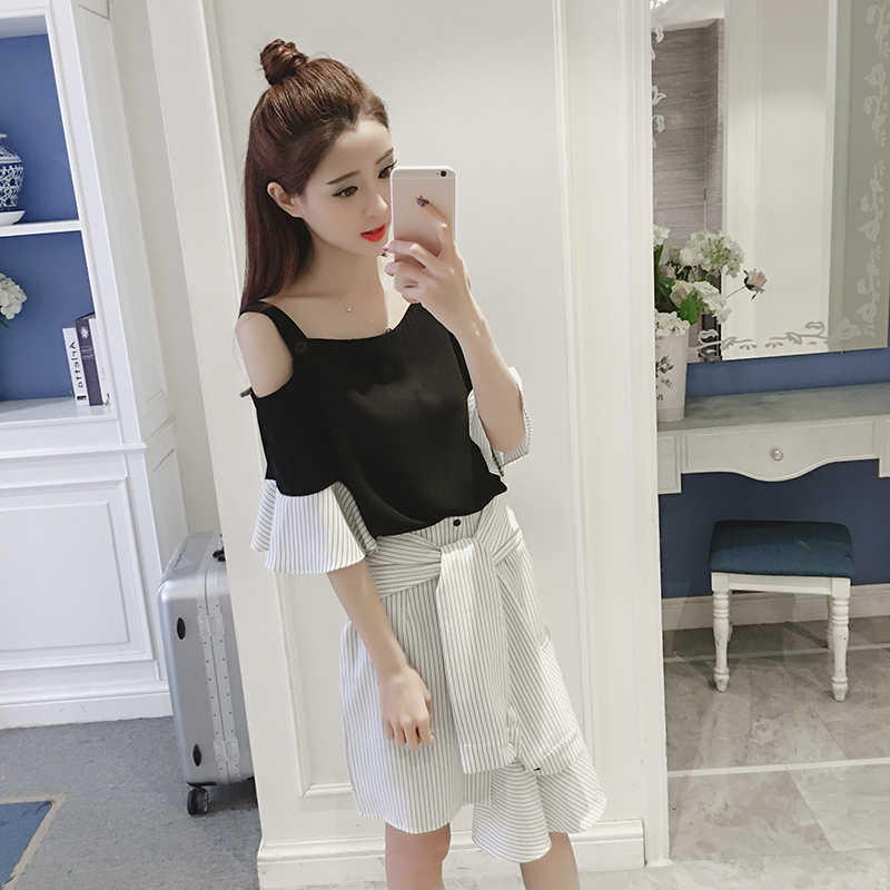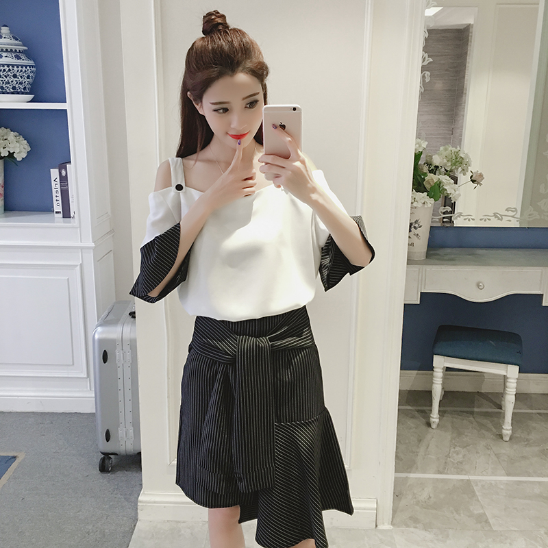 夏季新款女裝韓版一字領套裝裙顯瘦條紋露肩兩件套魚尾連衣裙