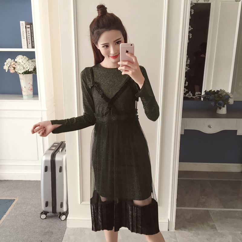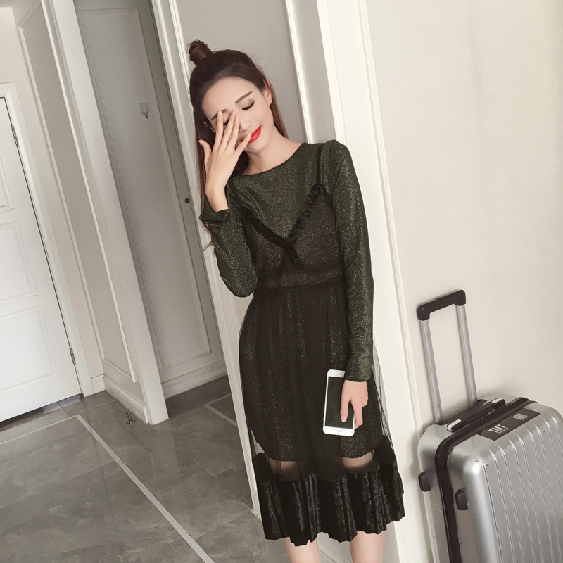 春裝新款女裝韓版網紗吊帶裙兩件套顯瘦中長款長袖打底連衣裙
