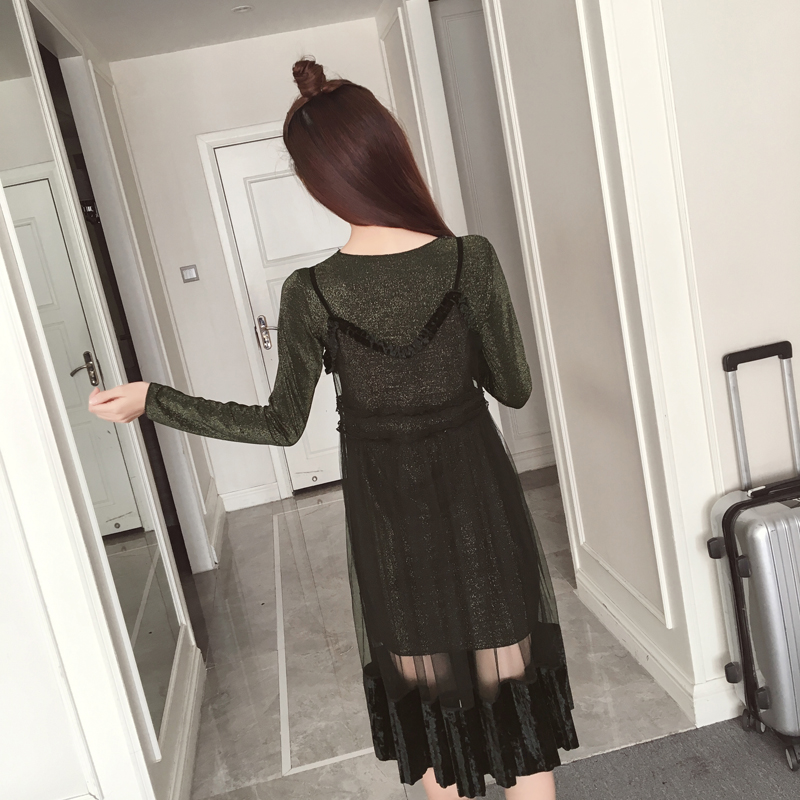 / 春裝新款女裝韓版網紗吊帶裙兩件套顯瘦中長款長袖打底連衣裙