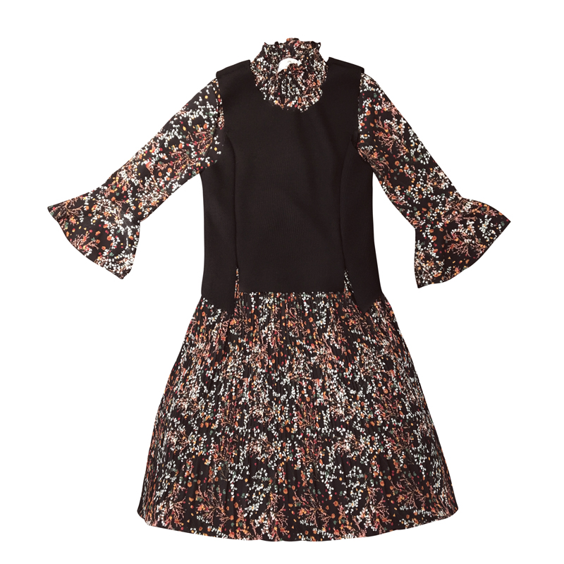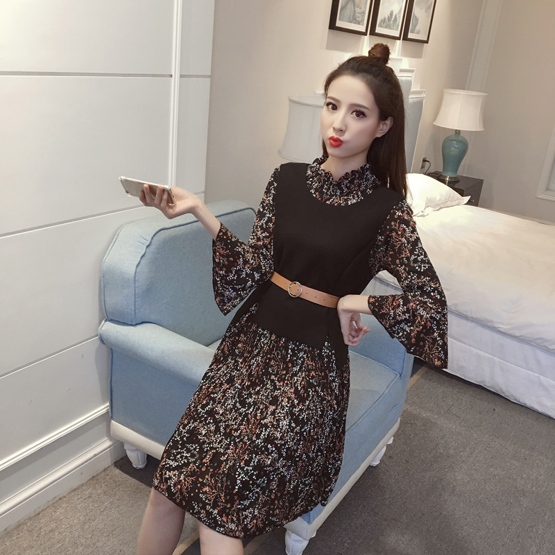 / 新款女裝韓版馬甲兩件套顯瘦中長款復古碎花雪紡長袖連衣裙春