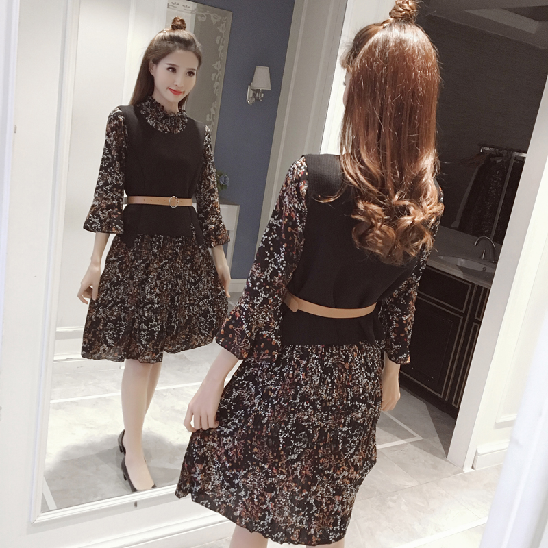 新款女裝韓版馬甲兩件套顯瘦中長款復古碎花雪紡長袖連衣裙春