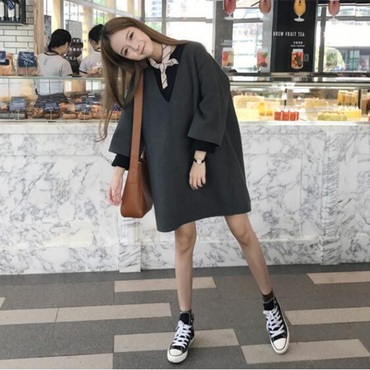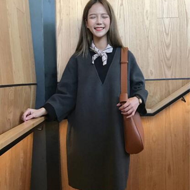 / 韓國overzise秋冬款寬松v領套頭休閑呢料口袋連衣裙女打底裙