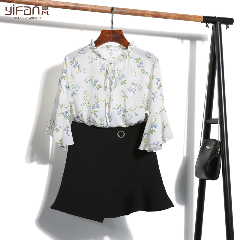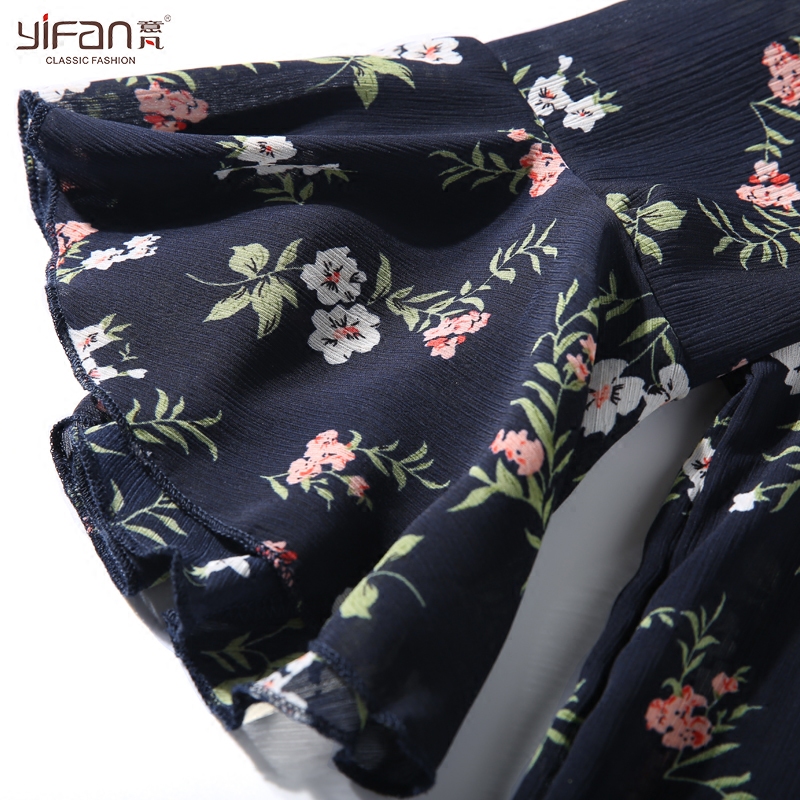 / 春夏寬松顯瘦七分袖百搭女裝上衣喇叭袖碎花雪紡上衣印花雪紡衫女
