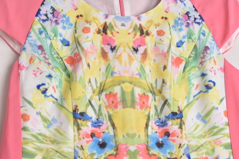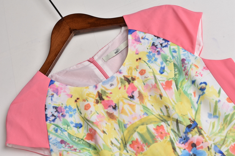 / 貨氣質女裝大碼拼色印花春夏新款圓領后拉鏈設計女裙