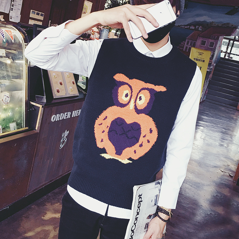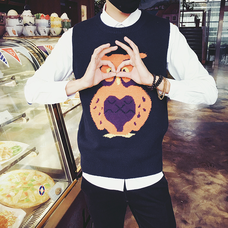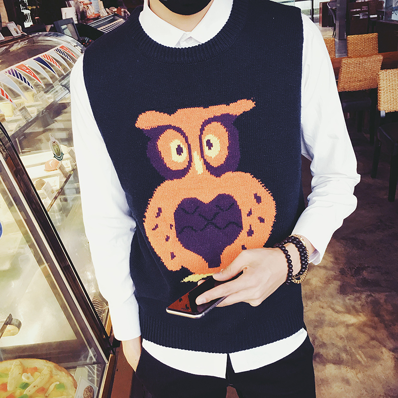 新款男裝韓版卡通動物提花背心針織衫毛線背心毛衣