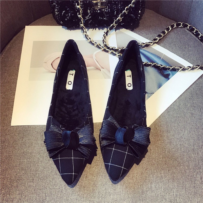 韓版2018秋冬新款百搭蝴蝶結毛毛鞋軟底加棉瓢鞋淑女鞋加絨平底鞋