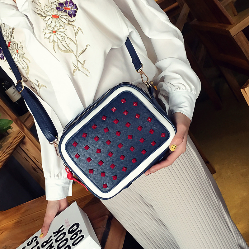 包包女新款潮撞色鉚釘小方包韓版百搭斜挎包個性單肩女包小包