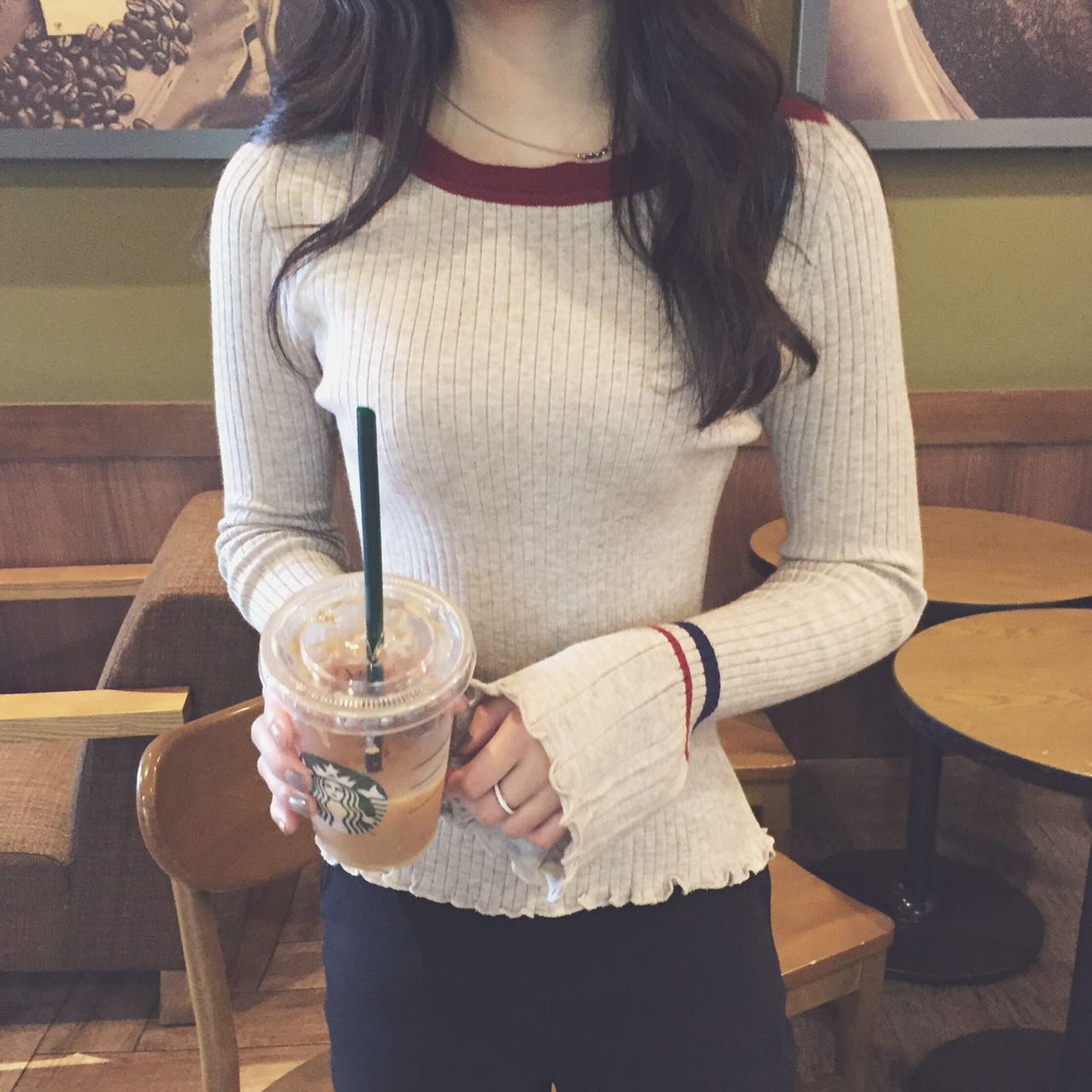 / 韓國chic秋冬撞色領喇叭袖螺紋打底衫修身木耳邊套頭針織衫女