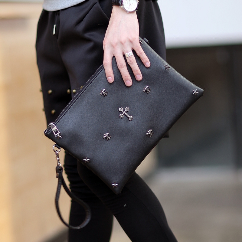 / 新款韓版男士新款手拿包潮流鉚釘手腕包休閑iPad單肩斜跨包