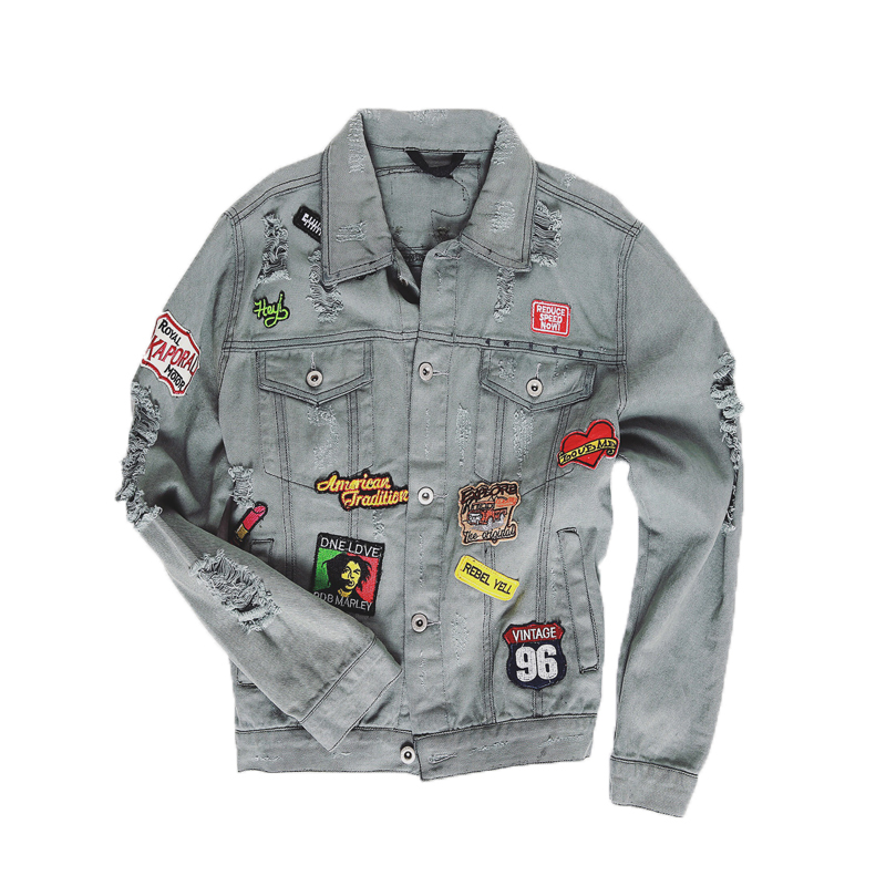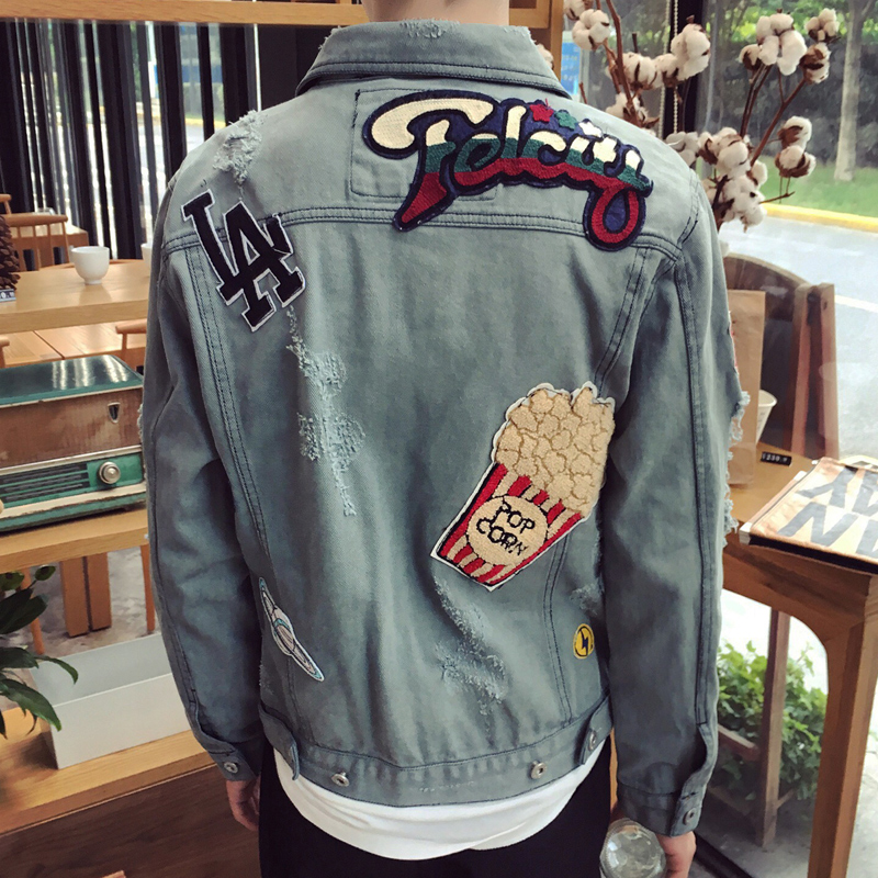 / 秋季新款原創徽章貼布水洗男士修身夾克牛仔外套